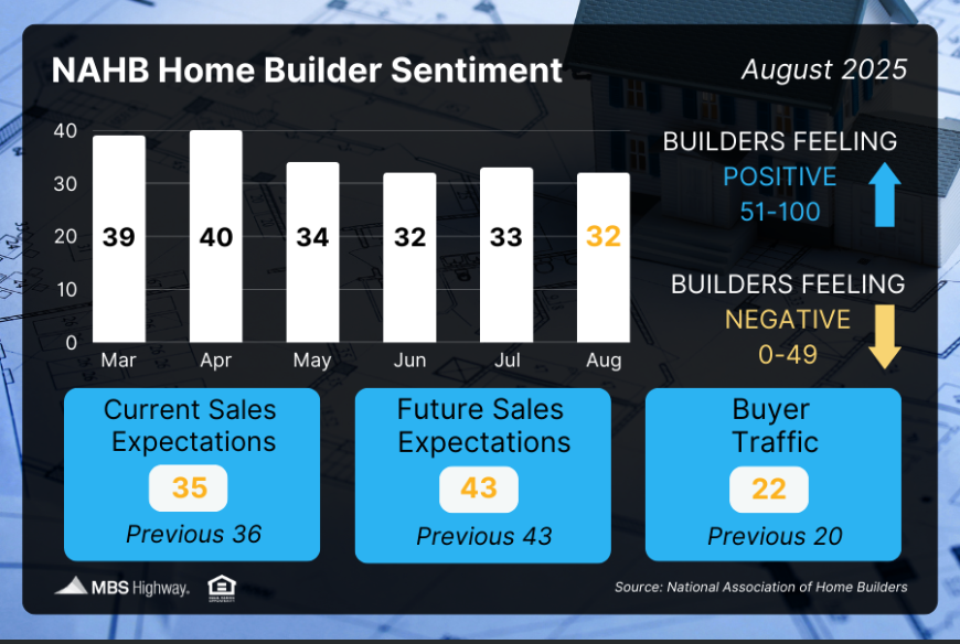 Builder sentiment for August 25′ (gauged by the National Association of Home Builders) was pessimistic, as it has been all year. Current sales expectations took a tip, and buyer traffic is at low levels as well. This news comes as many builder incentives are failing to entice buyers to purchase new builds.