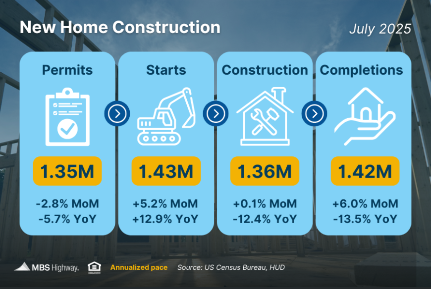 July-August have brought us a mix bag of builder data. July stats show year-over-year (YoY) weakness with some monthly gains in ‘homes under construction’ and ‘new homes completed’. Seasonally, new home completions tend to spike in the Spring/Summer months since many new home projects break ground with the seasonal change in March/April. Permits, which are the very beginning of a new home coming to market, were down month-over-month (MoM) and YoY, which could signify fewer homes coming to market in 5-9 months.